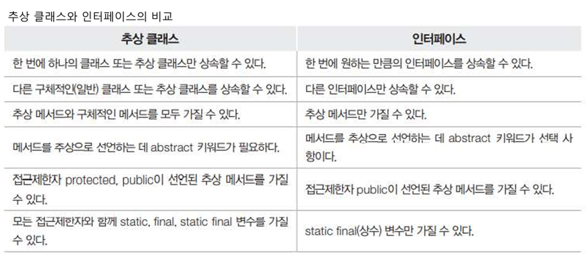 - 상속과 구현의 차이: 인터페이스는 구현보다는 행동을 지정하는 데 중점을 둡니다. 인터페이스는 클래스가 특정 메서드를 반드시 구현하도록 강제하지만, 상속 관계를 나타내지는 않습니다. protected는 상속을 통해 접근을 허용하는 것이기 때문에 인터페이스의 목적과 맞지 않습니다.