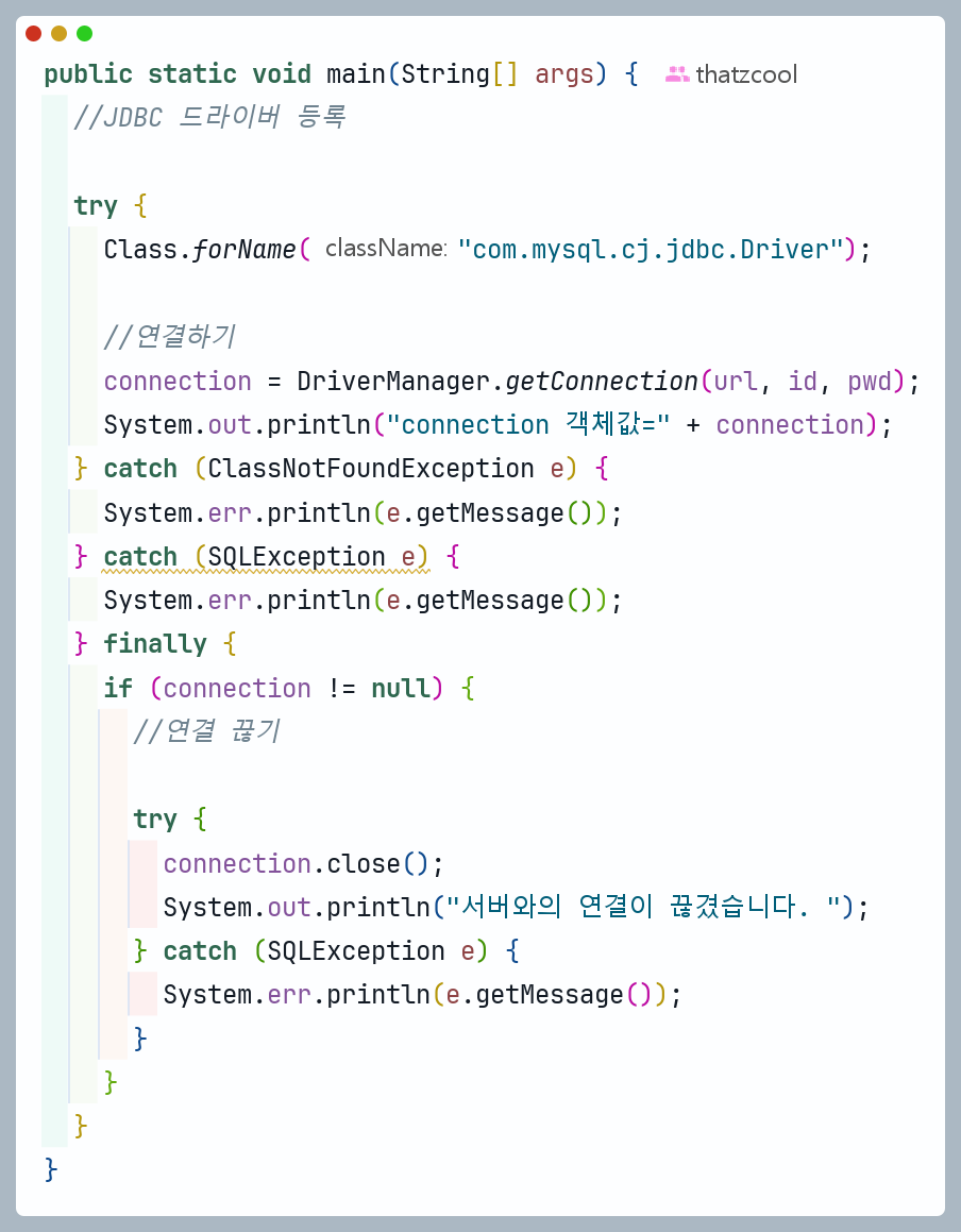 오늘은 어제의 복습으로 데이터베이스를 연동하여 CRUD 하는 간단한 프로그램을 만들었다. 이번에는 각 CRUD 기능에 초점을 두고 try catch 문으로 에러를 처리하는 기능을 추가하였는데, 모든 에러와 오류는 Throwable 클래스의 상속을 받는 클래스들이란 것을 처음 알게 되었다. 에러가 발생하면 그 해당하는 에러의 클래스 객체를 생성해서 에러 메시지를 출력해 주는 것이었다.