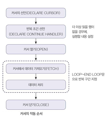 커서는 스토어드 프로시저 내부에 사용하는 기능으로 쿼리의 집합 결과를 한 행씩 처리한다.