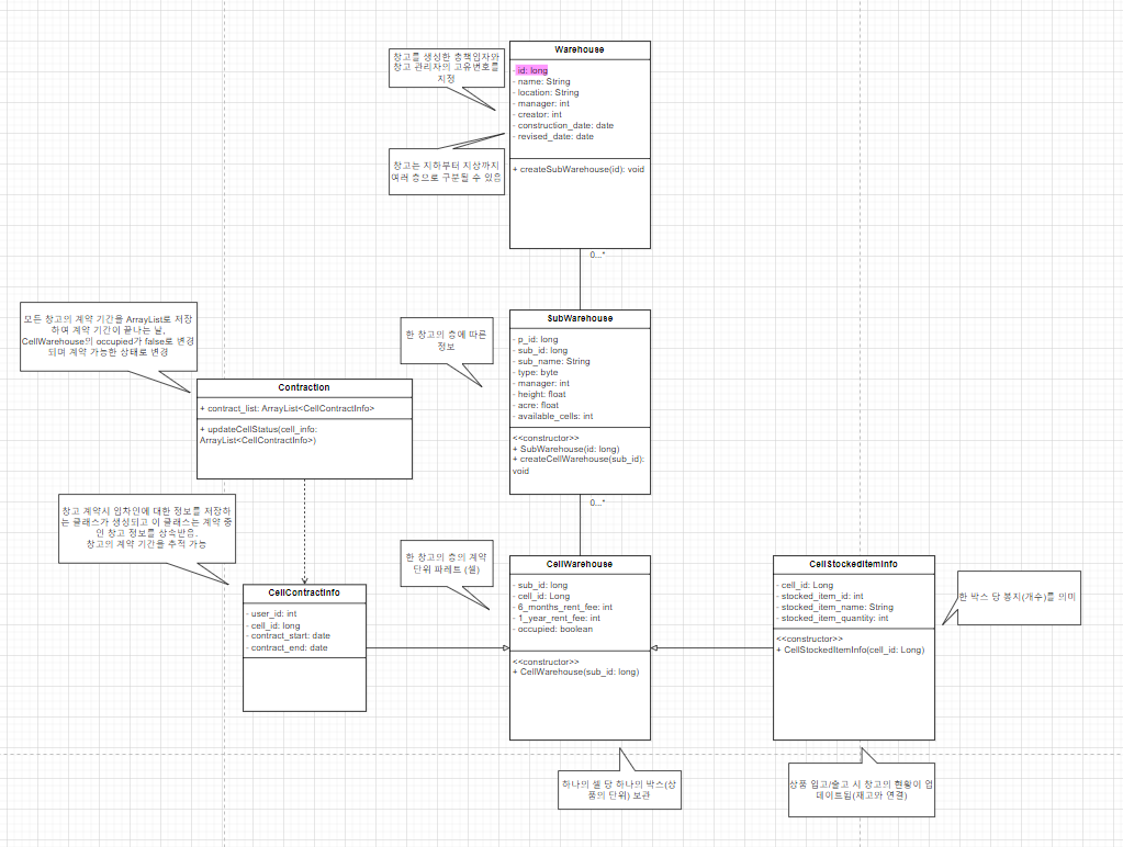 나는 창고와 출고 관리를 맡게 되었는데 클래스 다이어그램을 만들면서 생각하지 못했던 부분이 나왔다.