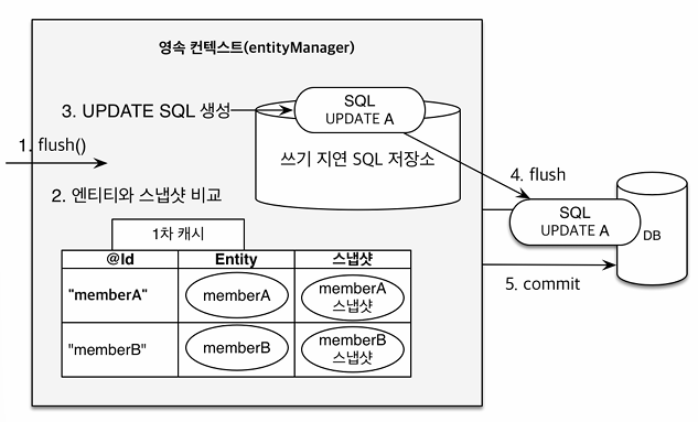 - 변경 내용이 있으면 쓰기 지연 SQL 저장소에 update 쿼리문을 생성한다.