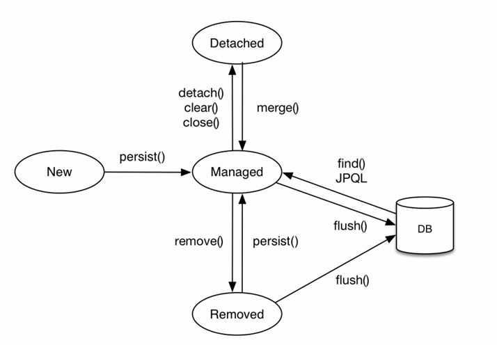 - em.persist를 통해 엔티티 매니저 안의 영속 컨텍스트에 객체를 저장한 상태로 객체는 관리될 준비가 됨