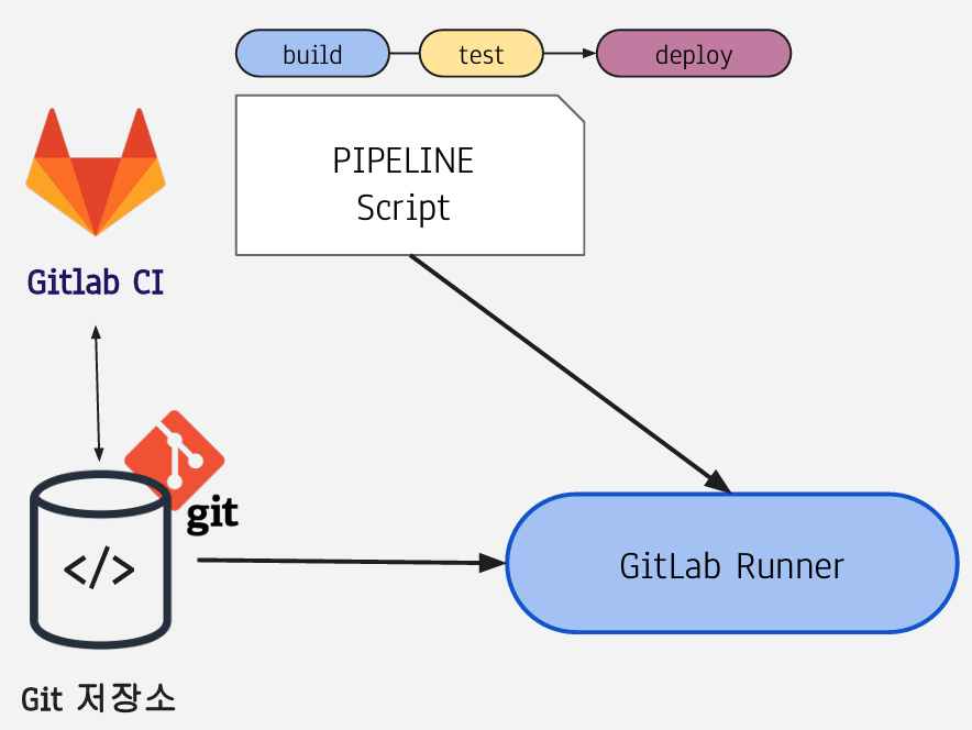 - GitLab Runner는 Git 저장소에서 빌드할 코드를 가져와 GitLab CI 설정에 따라 파이프라인 스크립트를 실행하여 배포