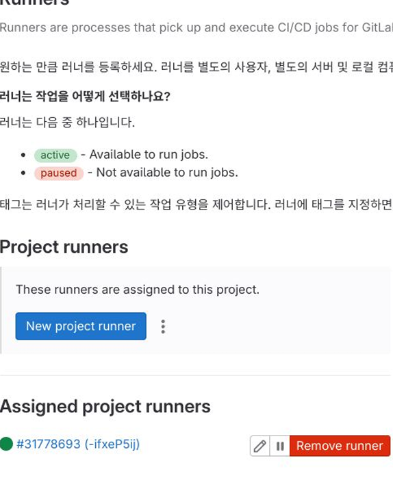 - GitLab은 GitLab CI와 GitLab Runner로 구성되어 있으며, CI가 Runner를 작동시켜 자동화 프로세스를 진행한다