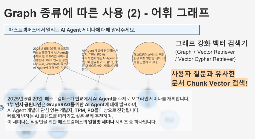 벡터 기반에 그래프 정보를 추가한 그래프 강화 벡터 검색기를 사용할 수 있다. 사용자의 질문과 비슷한 청크를 벡터 기반으로 검색한다. 초기 노드 집합을 검색 후 그래프 순회 로직을 통합하는 방식이다. 각 청크 안에 연결되어 있는 엔티티 정보를 확인하고 관계를 찾는 단계가 추가됨.