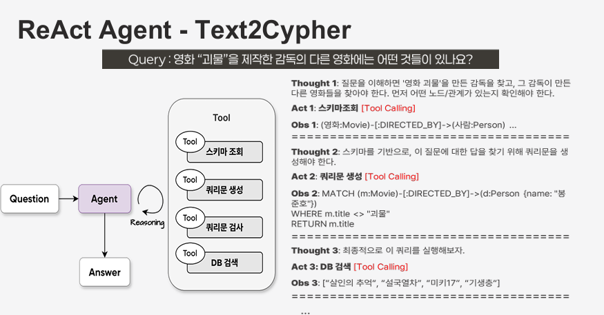 자신이 어떤 도구를 사용할 것인지 알고 있는 에이전트. text2cypher라는 기술로 동적으로 결정을 내리며 동작