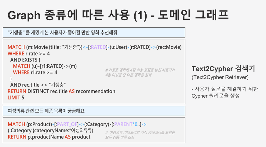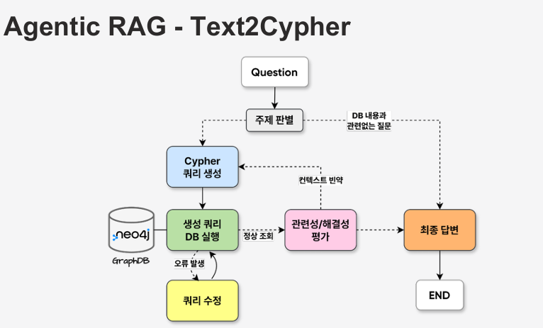 사용자 질문 -> 질문이 디비 검색이 필요한지 안한지 판단. -> 디비 검색이 필요없으면 답. -> 필요하면 cypher 쿼리를 생성후 실행. 쿼리 실행 중 오류가 있으면 쿼리를 수정하고 정상적으로 될 때까지 반복. 관련성/해결성 평가 노드를 추가하여 오류 발생 여부 + 검색된 컨텍스트가 질문을 해결되는지를 다시 확인. 질문과의 관련성을 평가. 성능을 높이기 위해서 LLM이 기여를 하고 LLM의 판단과 결정에 의해 RAG가 동작함